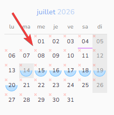 Les fermetures externes sont affichées sur les calendriers (mensuel ou détaillé) avec une petite croix rouge pâle.
