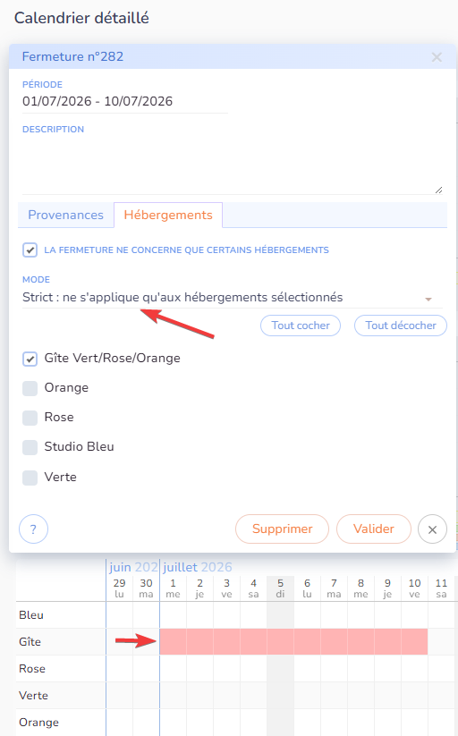 2) Fermeture stricte : vous ne souhaitez pas vendre l'offre “Gîte” début juillet, mais continuez à vendre les chambres. Créez une fermeture stricte sur le gîte.