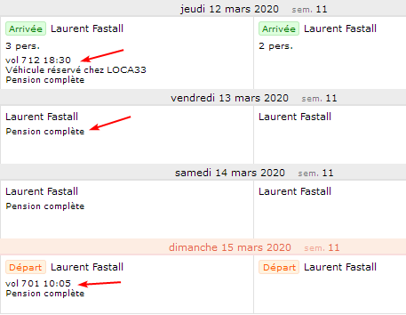 - les mentions “vol 712 18:30” et “Véhicule réservé chez LOCA33” seront affichées le jour d'arrivée