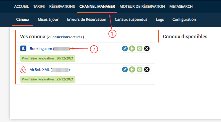 Sélectionnez l'option Channel Manager 1 / Canaux et cliquez sur le canal Booking 2