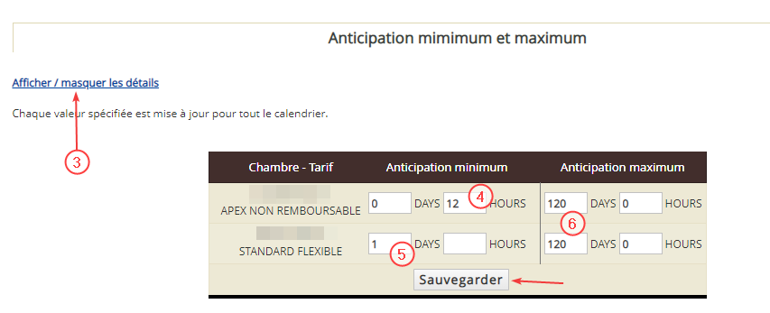 Sélectionnez l'anticipation minimum 6, en indiquant le nombre d'heures avant minuit. Par exemple si vous acceptez les réservations le jour même jusqu'à 14h, sélectionnez 10 heures. Si vous acceptez les réservations la veille pour le lendemain, sélectionnez 24h.