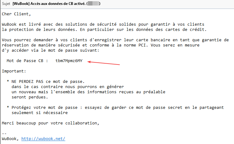 6) Wubook a créé une nouvelle clé de cryptage qui servira à coder les informations bancaires de vos clients. Cette clé de cryptage vous a été envoyée dans l'email “Accès aux données de CB activé”, elle est nommée par Wubook “Mot de passe CB”. La clé est alphanumérique.