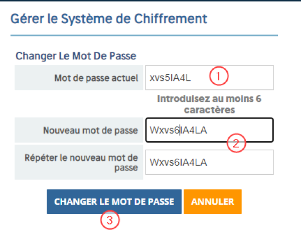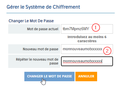 8) Dans la zone mot de passe actuel 1, saisissez la clé de cryptage ( “Mot de passe CB”) reçu par email à l'étape n°6. Saisissez votre nouveau mot de passe 2, puis cliquez sur “Changer le mot de passe”