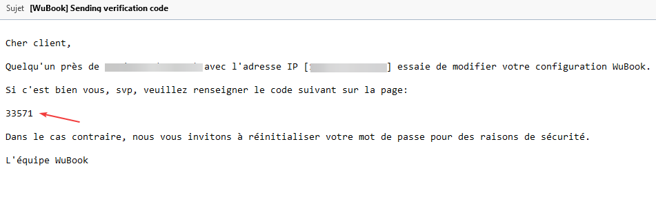 5) Vous avez reçu l'email de wubook contenant le code de vérificattion, récupérez le code dans l’email envoyé par Wubook et saisissez-le.