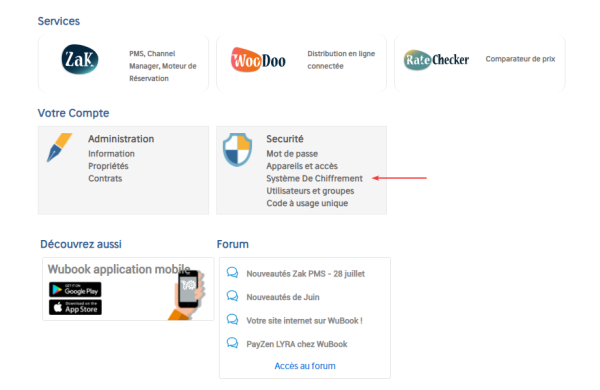 Accédez à Wubook, sur la page d’accueil, cliquez sur “Sécurité/ Système de chiffrement”.
