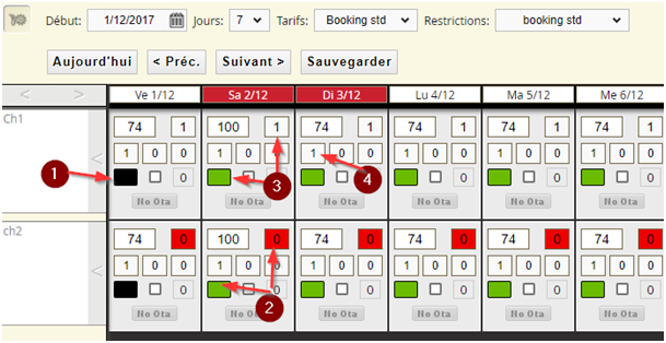 2 la chambre est ouverte (vert) mais n’est plus disponible (0 en rouge)