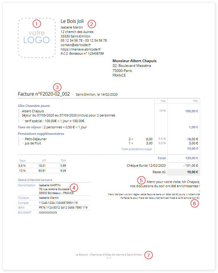 Cette personnalisation est souvent utile lorsqu'en plus des nuitées, vous louez des salles pour des événements en journée (par exemple pour des séminaires). Dans ce cas, vous souhaiterez peut-être disposer de 2 modèles de factures distincts.