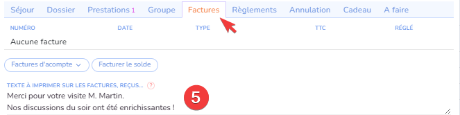 Le texte spécifique à la réservation est saisissable dans la fiche Réservation. Il doit être saisi avant de générer la facture.