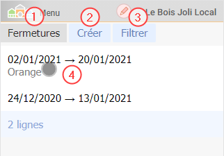 Appuyez sur “Créer” 2 pour définir une nouvelle période de fermeture.