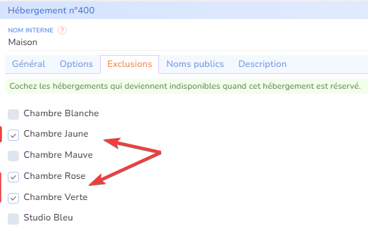 Par exemple, si vous louez les chambres “Jaune”, “Rose” et “Verte” séparément et les trois ensemble en formule “Maison”, et que vous louez la Maison, les trois chambres “Jaune”, “Rose” et “Verte” deviennent indisponibles, et inversement si vous louez l'une de ces chambres, la “Maison” est indisponible.