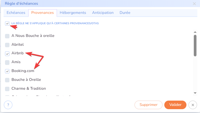 - provenance : chaque règle peut dépendre de la provenance de la réservation. Par exemple, vous pourrez calculer une échéance de paiement unique pour les plateformes de vente comme Booking ou Airbnb, mais pour vos réservations directes, vous pourrez demander un acompte de 30% le jour de la demande, puis demander le solde la veille du départ.
