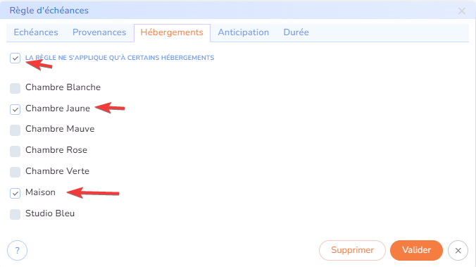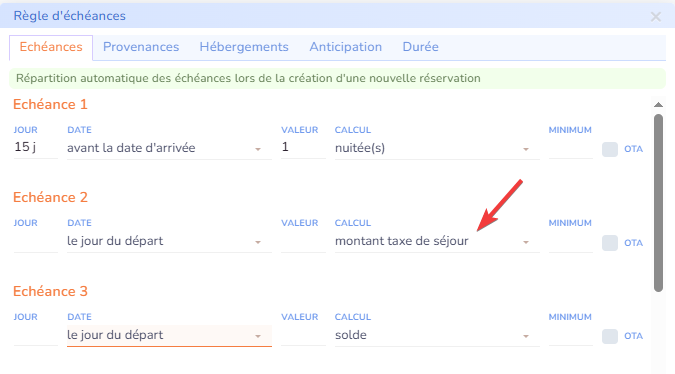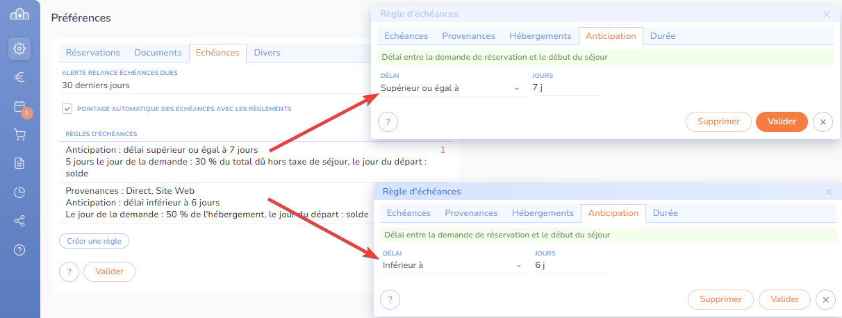 - anticipation : vos règles d'échéances peuvent aussi dépendre du nombre de jours d'anticipation (nombre de jours entre la prise de réservation et la date de début du séjour). Par exemple, pour un séjour à moins de 15 jours, vous pouvez exiger un paiement intégral par avance, alors qu'à plus de 15 jours, vous pouvez ne demander qu'un acompte.