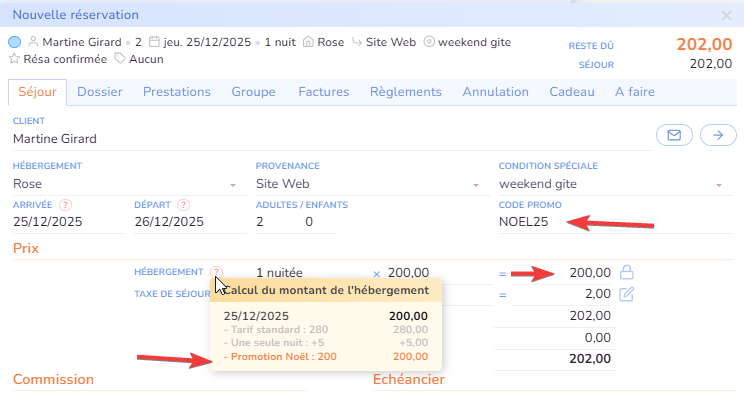 Pour obtenir le prix d'une promotion dans une réservation saisie manuellement, vous pourrez saisir le code promotionnel sur la fiche réservation.