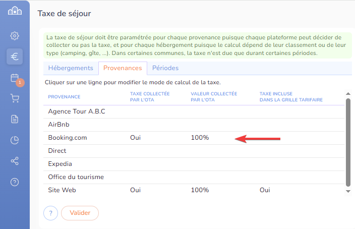 Pour chaque provenance, vous indiquez si le montant de la nuitée, saisi dans la grille tarifaire, englobe ou non la taxe de séjour. Dans le menu “Paramètres & tarifs”, sélectionnez “Provenance des clients” puis pour chaque provenance cochez ou non “Déduire taxe de séjour”.