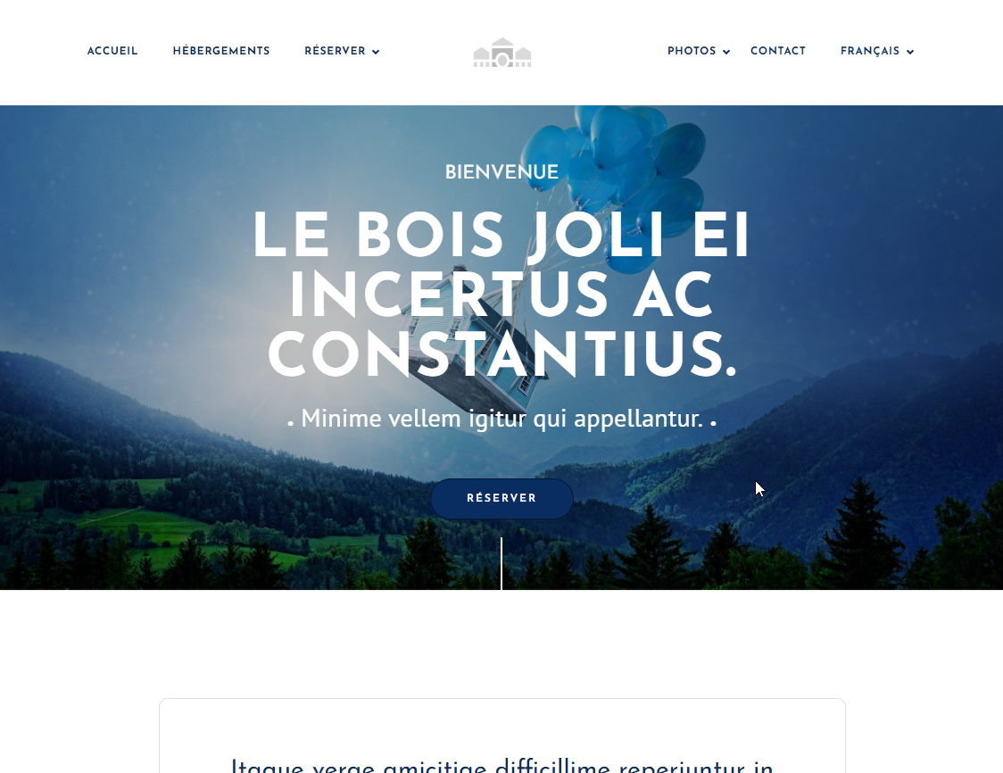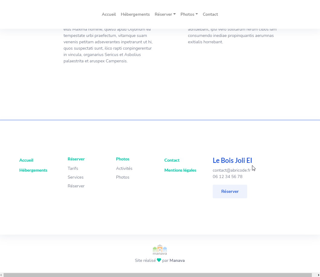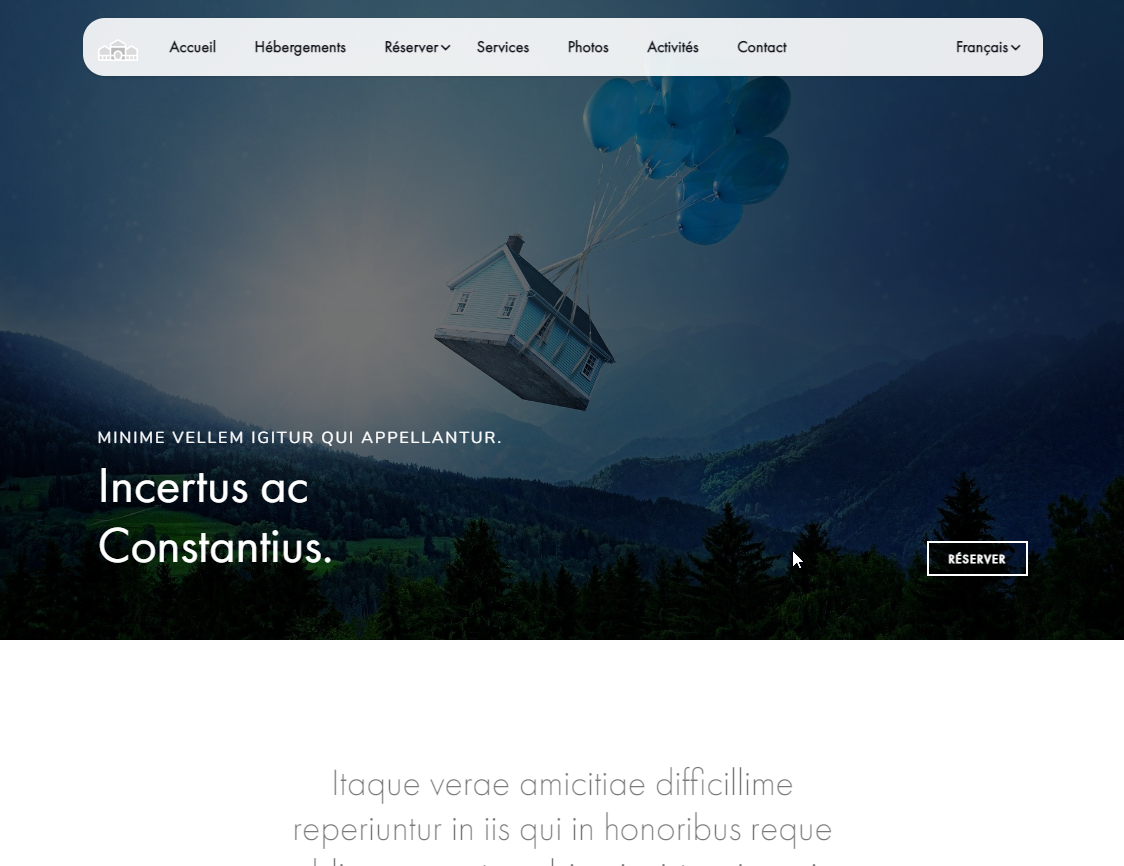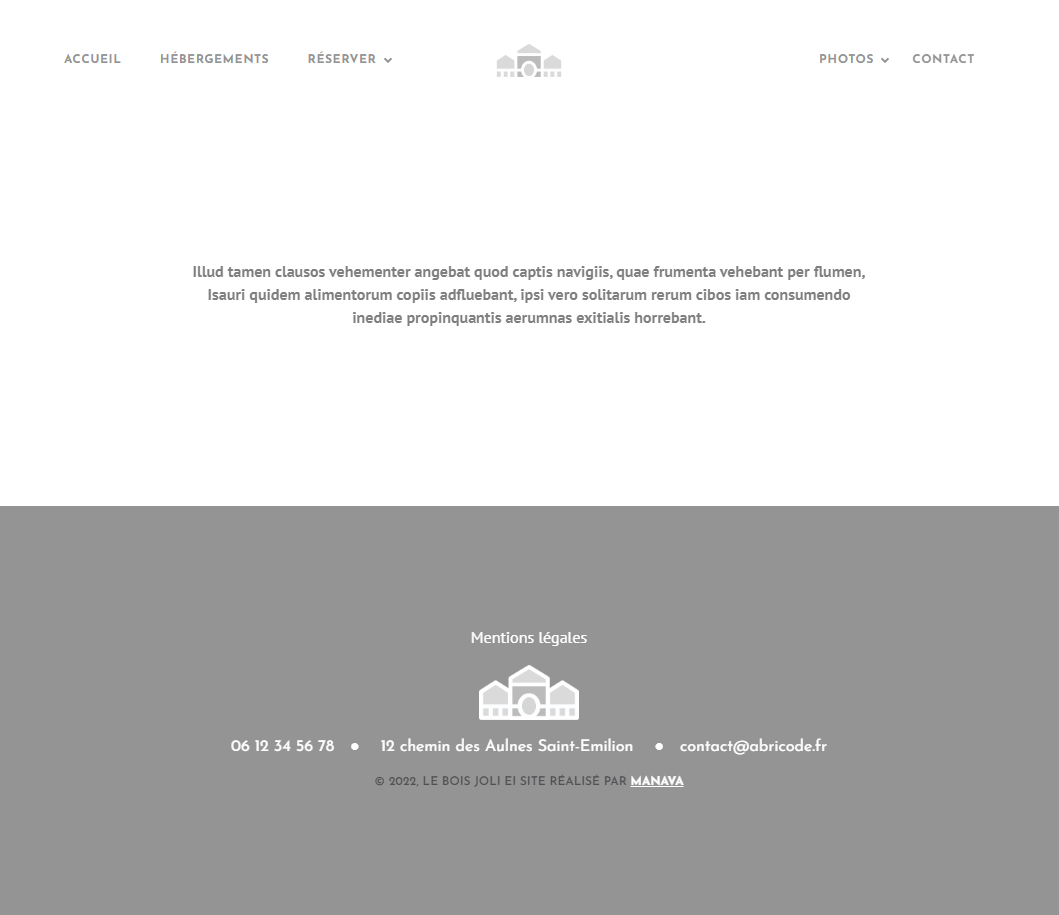 10 pages : accueil, hébergements, une page par hébergement, tarifs, réserver, services, photothèques, activités, contact, mentions légales.