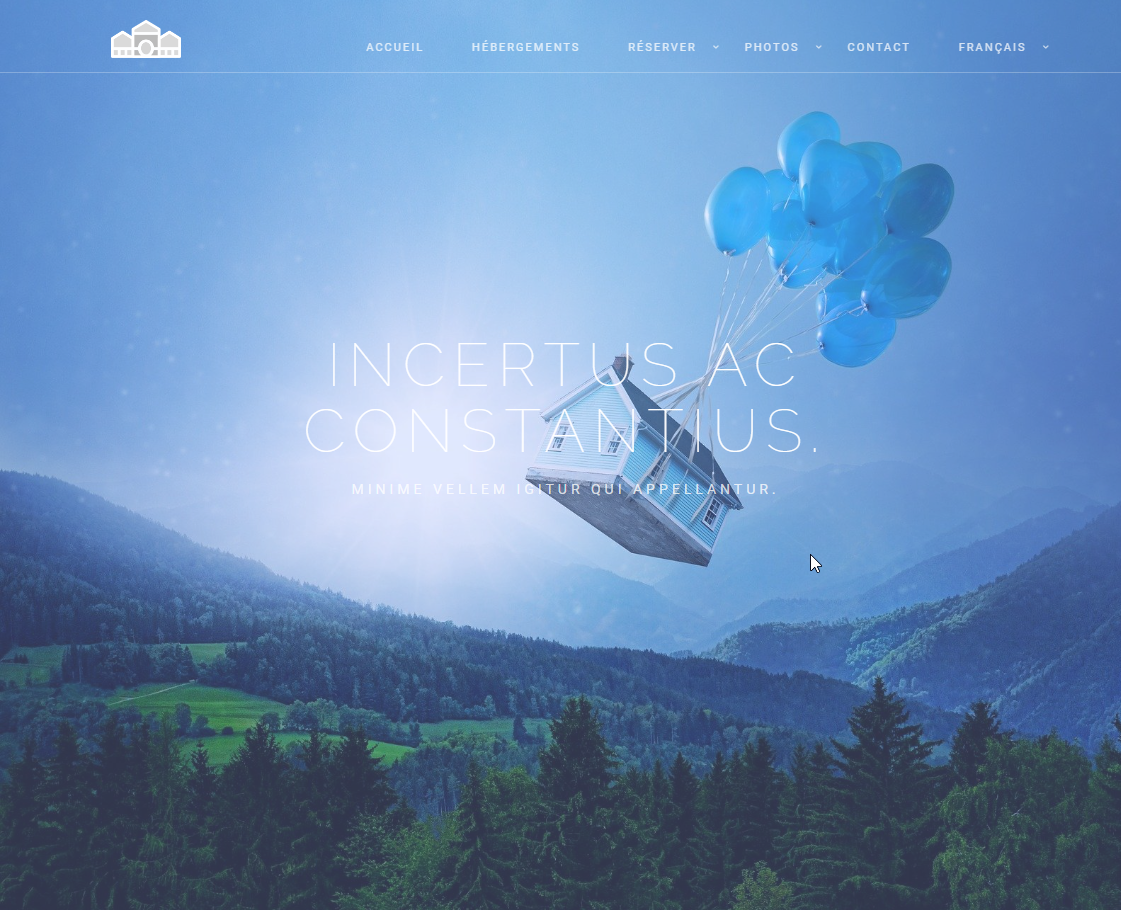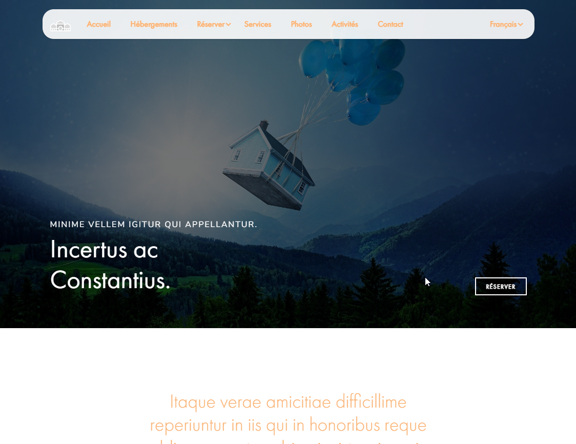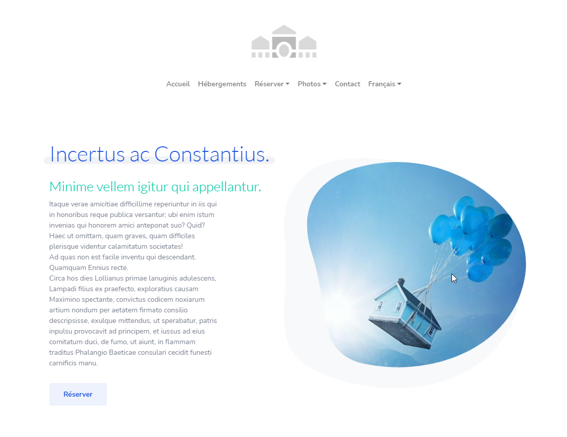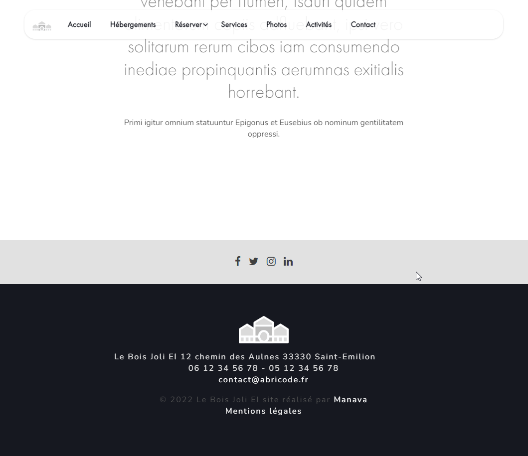 10 pages : accueil, hébergements, une page par hébergement, tarifs, réserver, services, photothèques, activités, contact, mentions légales.